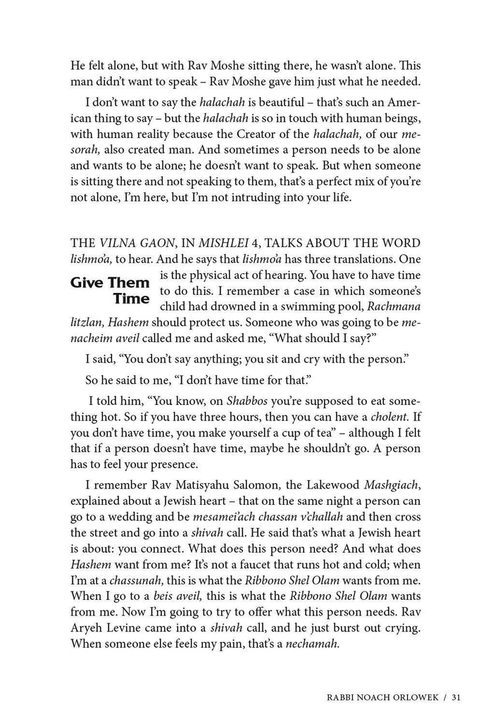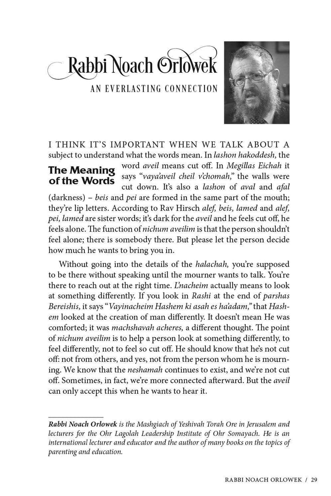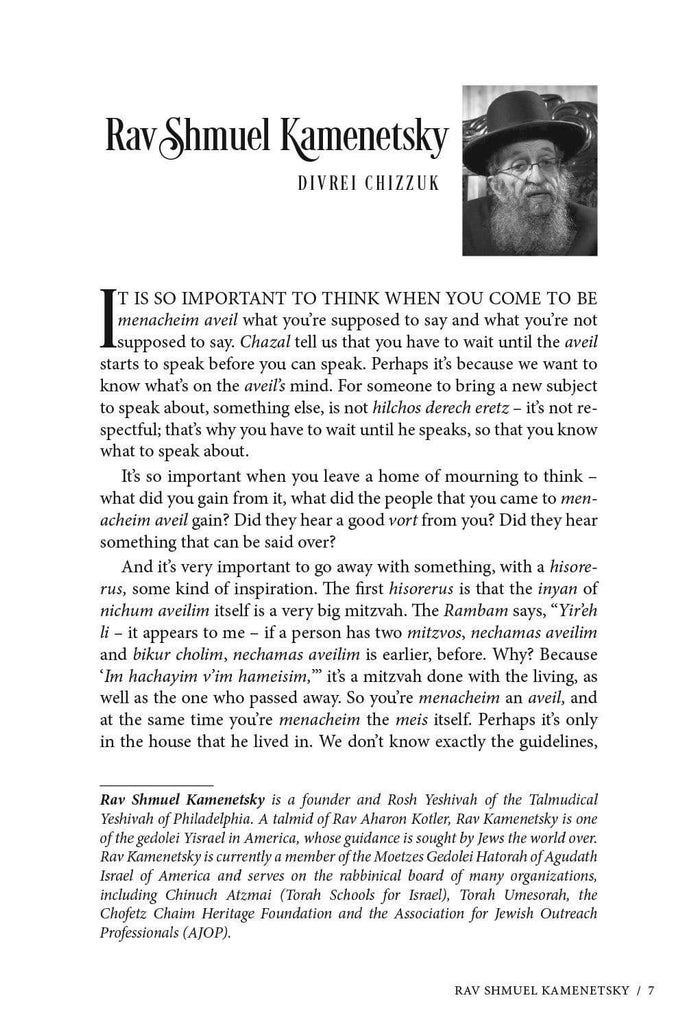 This volume is an invaluable guide for every Jew in how to go about this mitzvah, give chizzuk and share perspective during times of loss. Thirty-six dynamic rabbis, professionals and laypeople who have experienced personal tragedy offer halachic and hashkafic guidance and encouragement.