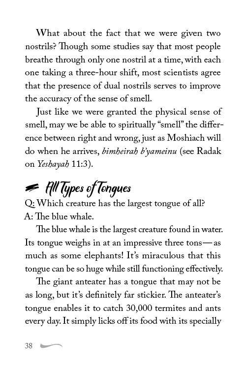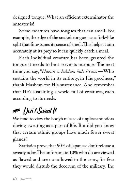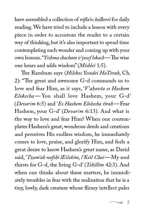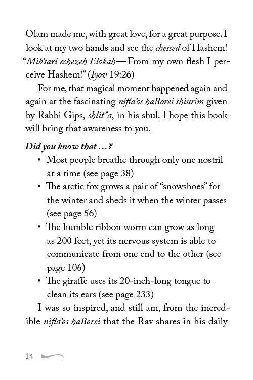 An astounding collection of nifla'os haBorei (wonders of the Creator) with practical lessons and insights, for daily reading or as a Shabbos table companion