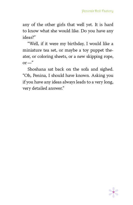 Penina has a great idea brewing. When her friend Gittel gives her an unusual new doll, Penina discovers a wonderful opportunity to help others. Things don't work out exactly as planned, but Penina learns an important lesson about always trying her best.