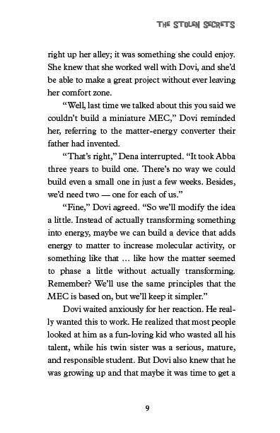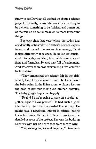 The Abrams twins, Dovi and Dena, are busy preparing for their upcoming science fairs when strange events start occurring. First someone breaks into their home, and then the plans for their father's amazing new invention are stolen. Who is targeting the Abrams family, and can they be stopped before Dr. Abrams loses control of his powerful creation?